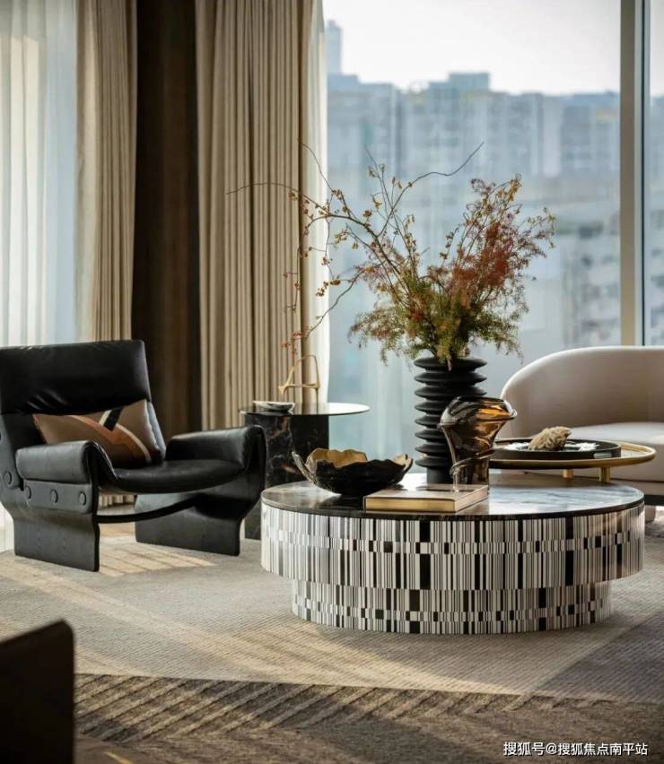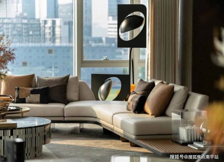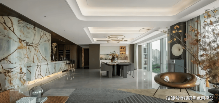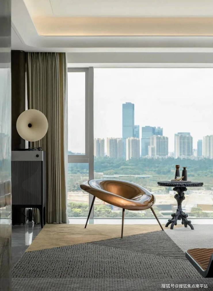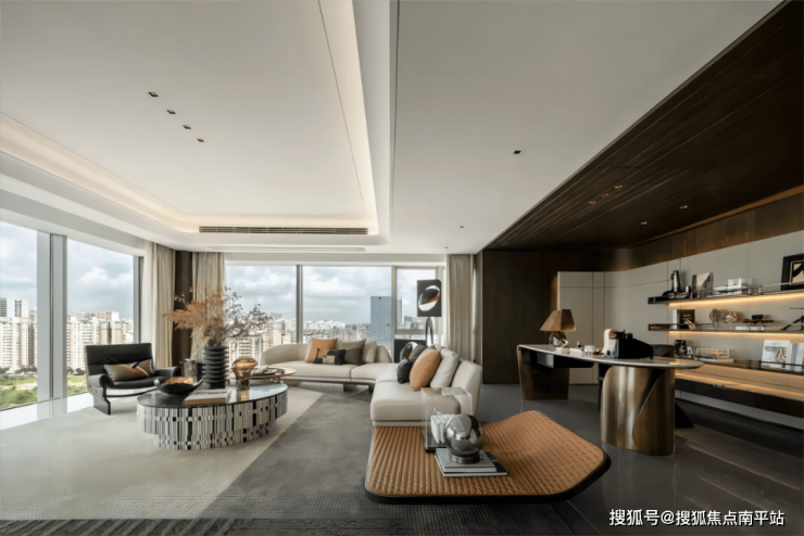 开阔的布局形式营造出轻松温馨的氛围,城市美景一览无余,私享天际线。运用不同材质的家具组合,让空间充满生活气息,俯瞰都市繁华。