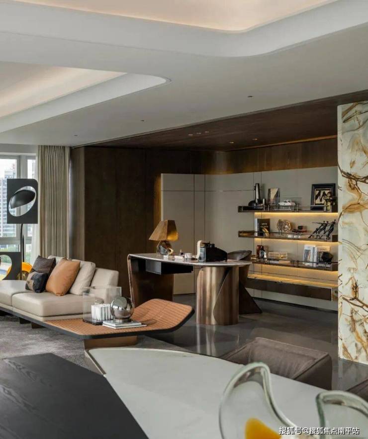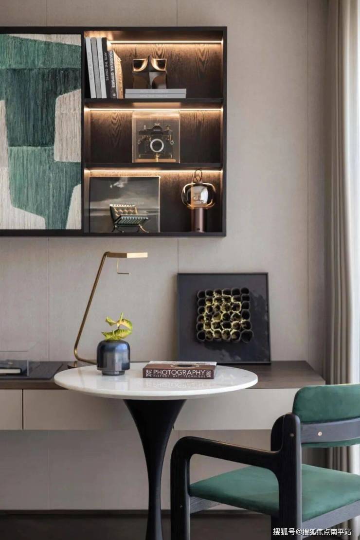 精致的金属展示柜映衬着暖意的灯光,为珍藏的艺术品赋予独特的魅力,大理石书桌搭配古铜色几何造型桌脚,每一处细节都在述说着自信优雅的生活格调。