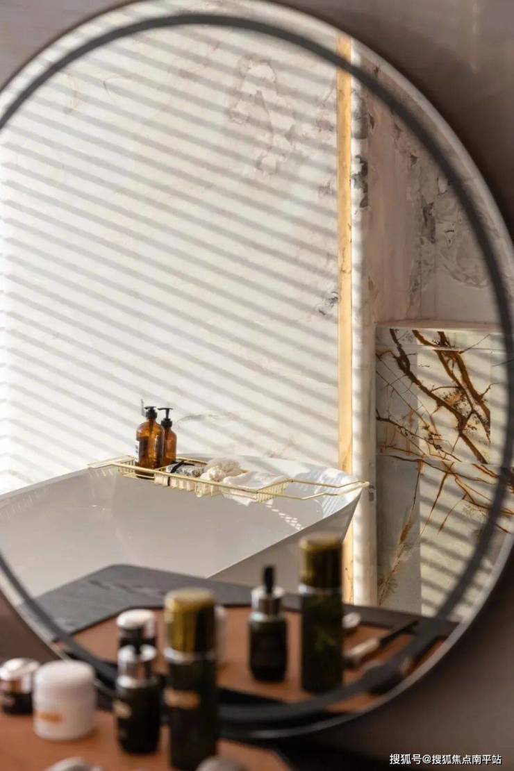 主卧卫生间以21m²奢阔的大尺度赋予了奢华酒店的舒适体验感,整体墙地面采用天然纹理的奢石打造,台面长达2.6米,为男女主人打造更具舒适与便利的功能空间。