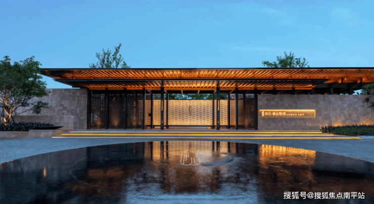 从环岛落客区开始,墨色水景、非对称挑檐、莱姆石以及漭水纹样、玻璃照壁…