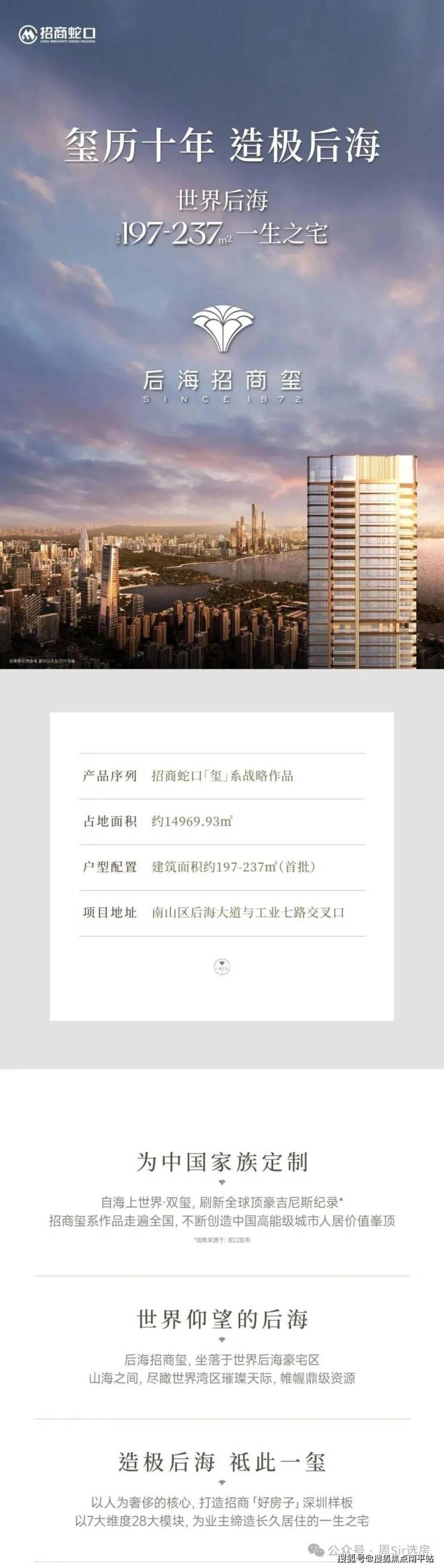 「后海招商玺」为招商玺系升级代表作,在产品品质上势要突破自我,尤其是公区车库,都是相当划时代的。商品房是四房大平层起步,作为新晋豪宅。地处深圳湾和蛇口交汇,会吸引不少原深圳湾、蛇口等地缘购房者的置换需求。
