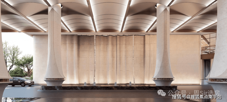 「后海招商玺」车行大门做了殿堂级落客区,设有天幕和水景,非常具备归家仪式感。