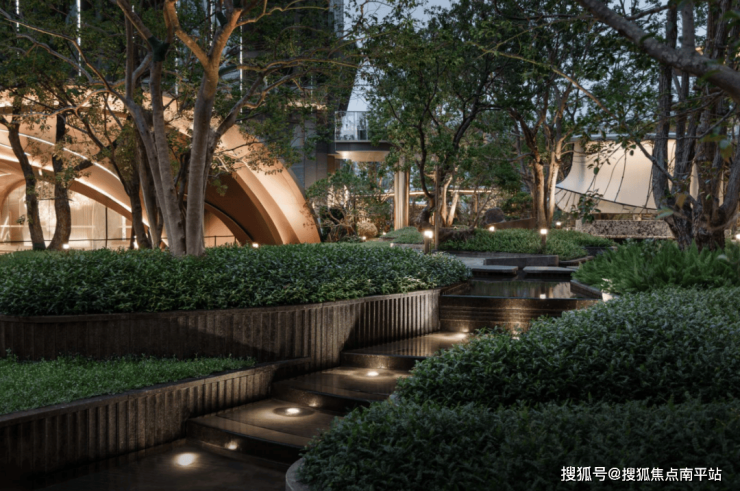水流从入口叠水瀑布倾泻而下,奔向中央镜面水池,再沿着步道溪流蜿蜒流至全园各处,业主们沿着步道漫步,能依次体验 “听水的舒缓、观水的灵动、亲水的惬意”,这是传统平面园林没有的感受。