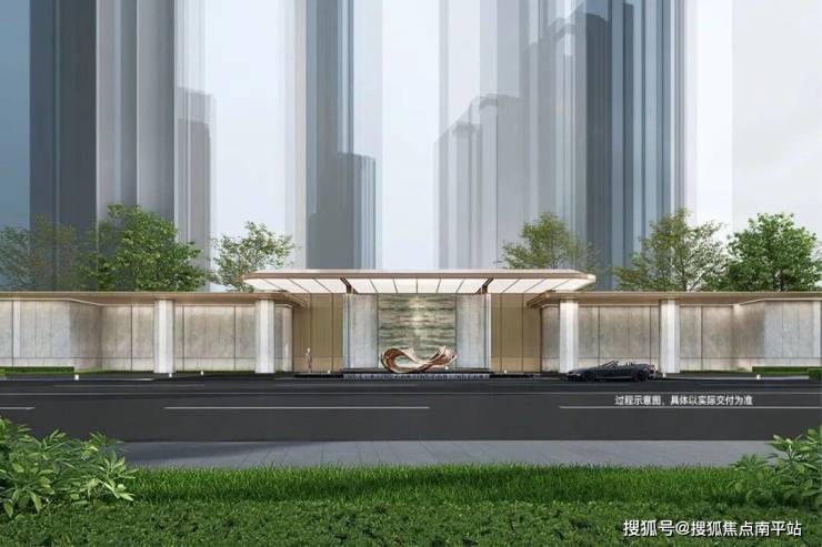 高门大院:中央景墙约7.5米恢弘石材高门,连接两侧构成超80米巨幅门仪,气度不凡;
