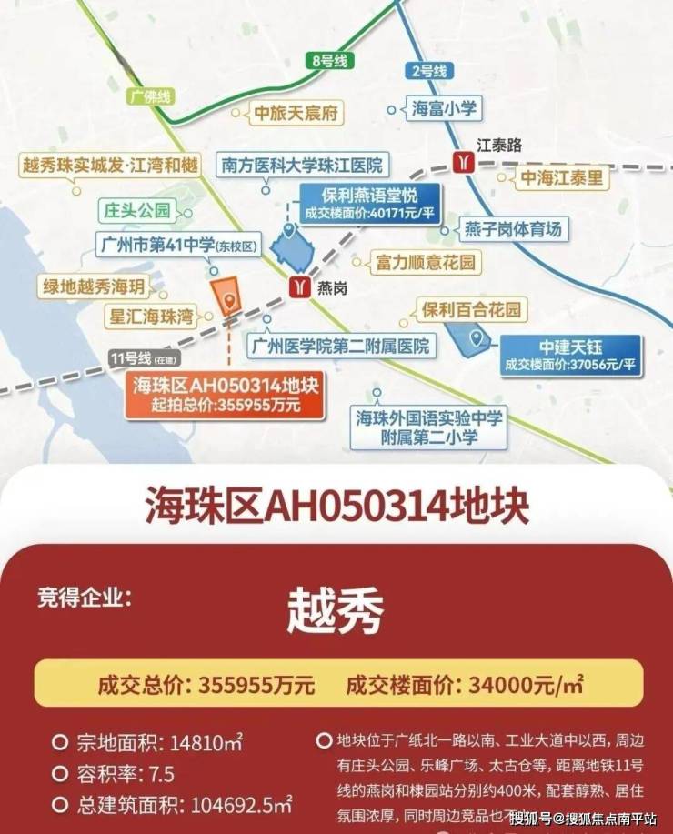 广纸314地块在2025年9月19日出让,越秀以楼面价3.4万/㎡、总价35.6亿元拿下,该地块体量不大,占地面积14810㎡,出让面积13959㎡,总建面约104693㎡。