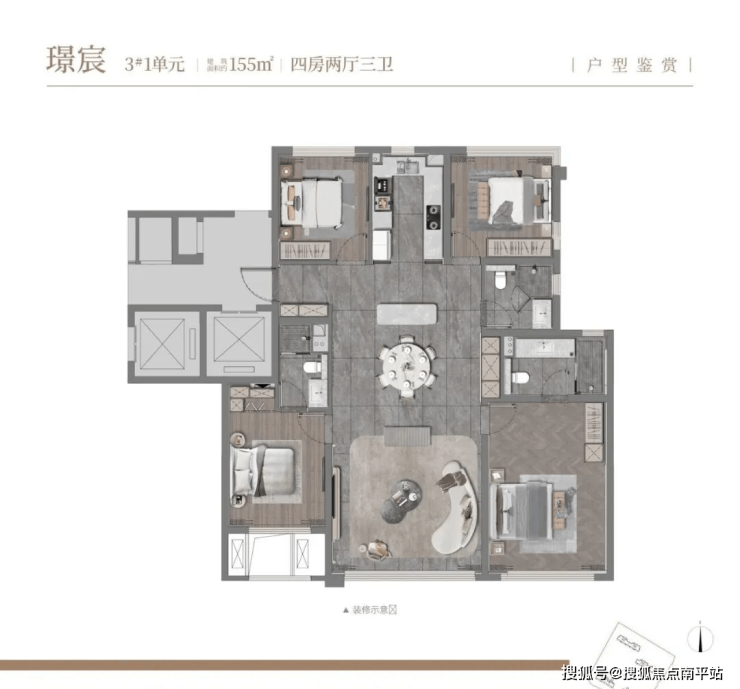 ④155平户型,四房两厅三卫:位于3号楼单元衔接处的边户,不过在整栋楼栋里实际属于中间户范畴。该户型与153㎡户型的结构较为接近,核心差异在于主卧未配备双面全景舱飘窗。也正因为这一设计区别,155㎡户型的得房率低于153㎡户型,最终造成二者使用面积相近时,155㎡户型的建筑面积反而更大。