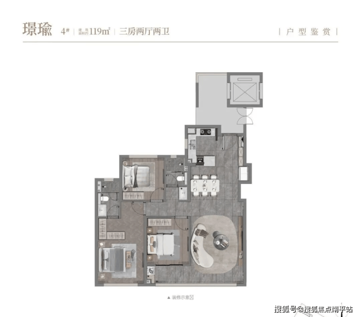 ①119㎡户型:三房两厅两卫:位于2、4号楼的中间户位置,户型为南北半通透设计,北侧房间对着连廊,这会对居住私密性产生一定影响。整体结构比较常规,该户型的主要优势在于相对更低的总价,且配备双开门电梯,即便作为中间户,也拥有独立的电梯前室。