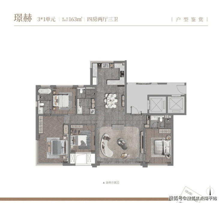 ⑤163平户型,四房两厅三卫:位于3号楼的端头西边户位置,户型做到了南北通透,且有四开间朝南的设计优势。该户型配备独立电梯前室,南向主卧还带有270°双面飘窗;整体户型呈现大开间、短进深的特点,居住起来舒适度较高。不过需要注意的是,该户型中同样存在一个无采光的暗卫。