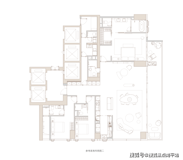 奢丨双套房奢阔合理。主卧-朝东侧海景布置,大面宽落地门窗连接景观阳台,阔绰酒店式套房设计,形成完整私域空间。次卧-尺度合理,灵活布置,与主卧互不干扰。