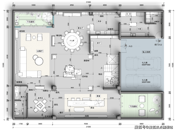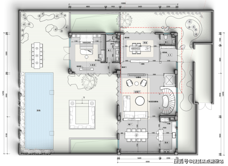 建筑面积:约173㎡,5房4厅7卫+2保姆房+2车位+1庭院泳池,使用面积940m²-1280m²