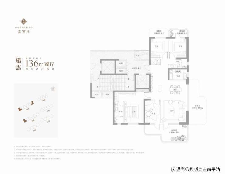 小区容积率 2.99,居住舒适,一共 6 栋楼,3 栋高层、3 栋洋房,全部精装交付。高层实现一梯一户,有 136㎡的四室两厅两卫,有方正客厅和端头客厅两种户型,赠送面积差不多有 40㎡;洋房 166㎡的户型更稀缺,赠送面积能到 50㎡。每家每户都有大露台,就像把小花园搬到了家里。