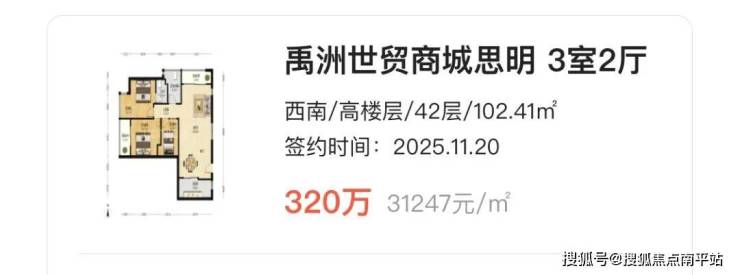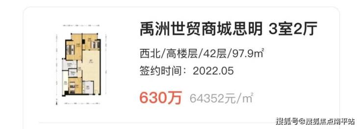 思明火车站——禹洲世贸商城,102.41平3房,成交单价31247元/平,成交总价320万;2022年相似户型成交单价64352元/平,成交总价630万;3年时间,总价调整了310万。