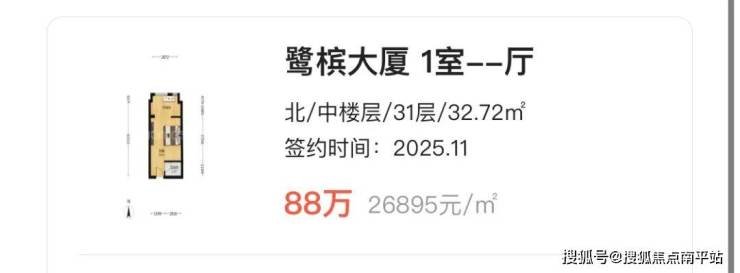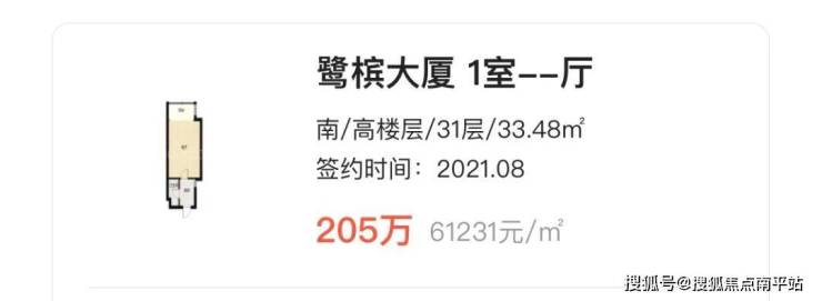 湖里邮轮城——鹭槟大厦,32.72平1房,成交单价26895元/平,成交总价88万;2021年同户型成交单价61231元/平,成交总价205万;4年时间,总价调整了117万。