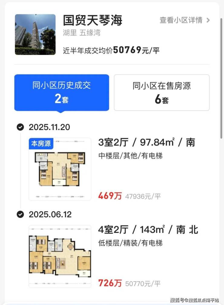 湖里五缘湾——国贸天琴海,97.84平3房,成交单价47936元/平,成交总价469万。