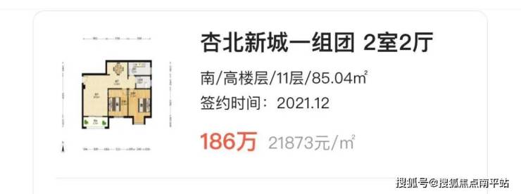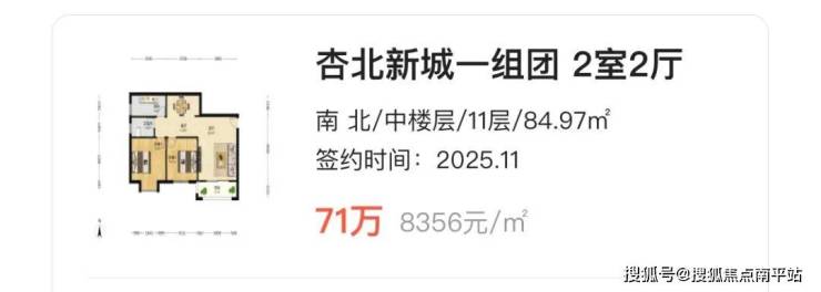 集美北站——杏北新城一组团,84.97平2房,成交单价8356元/平,成交总价71万;2021年同户型成交单价21873元/平,成交总价186万;4年时间,总价调整了115万。