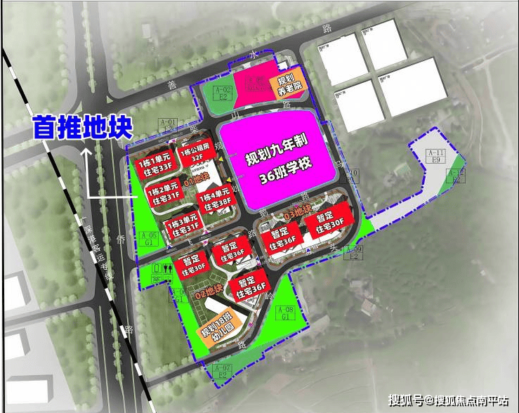 地块规划:首推01地块,占地1.53万㎡,建面13.68万㎡,计容9.55万㎡,容积率6.23,绿化率30.03%。由5栋住宅组成:1栋1单元33层、2/3单元各31层、4单元38层、5单元公租房32层。地下车库含公交首末站。