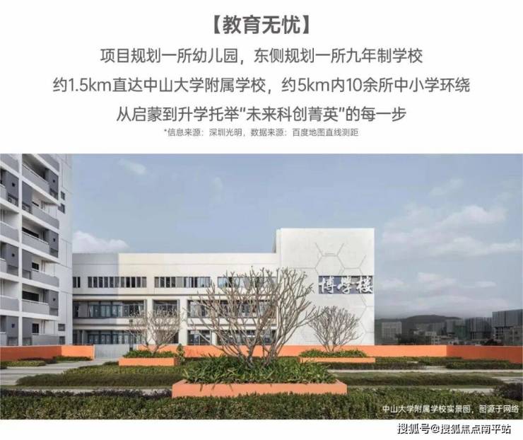 教育:越秀星科源启提供全龄教育资源。项目内规划18班幼儿园,东侧拟建36班九年制学校,未来一站式服务。中山大学深圳附属学校(小初)教学质量高,2025年9月学位充足。周边高校环绕,形成全链条教育体系,促进孩子成长。