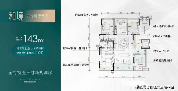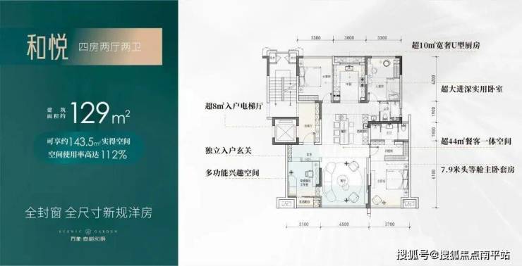 1#共20套建面129㎡户型,得房率约112%,参考价格10100-10500元/㎡;