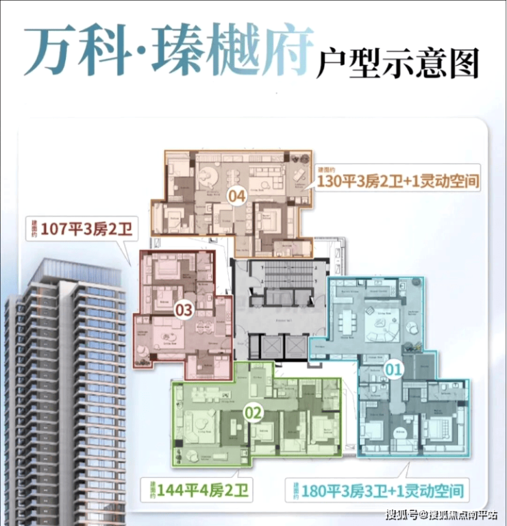 万科瑧樾府主推107㎡-130㎡-144㎡-180㎡三至四房户型,以改善型需求为主,兼顾不同家庭结构的居住需求。