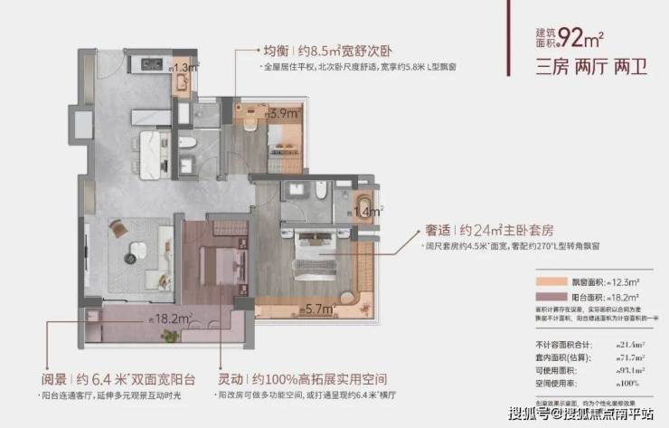 例如,建面约92㎡的三房户型,通过全落地飘窗设计赠送了约12㎡实用空间,主卧宽敞达约24㎡;122㎡的四房户型则额外提供了约22㎡的可利用空间,主卧面积接近33㎡,尺度可对标旧规150㎡产品。