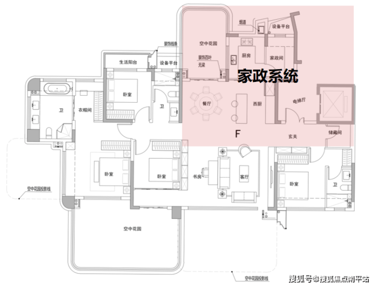 仔细看文澜天玥205㎡户型的家政系统,它是由6个部分组成——分别是入户储藏间、中餐厅、西餐台及餐边柜、U型厨房、家政间(保姆房)、北向空中花园。