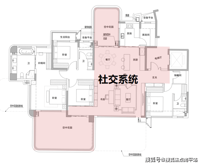 进入客厅区域,中西餐厅与客厅、书房,打造出近60㎡的社交超级主场。再结合南北向超大空中花园,既可以满足业主一家老小各自安逸的环境,也可以营造朋友聚会的泡茶、聚餐、品鉴收藏的舒适环境。