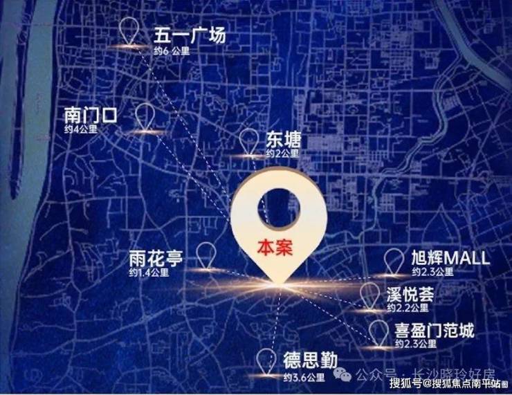 项目距雨花亭直线距离约1.4km、距离五一商圈近约6km