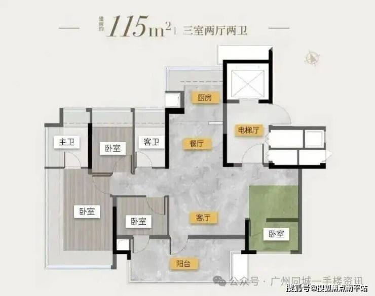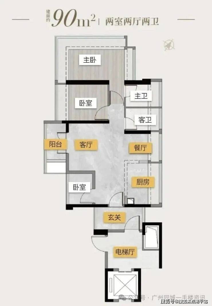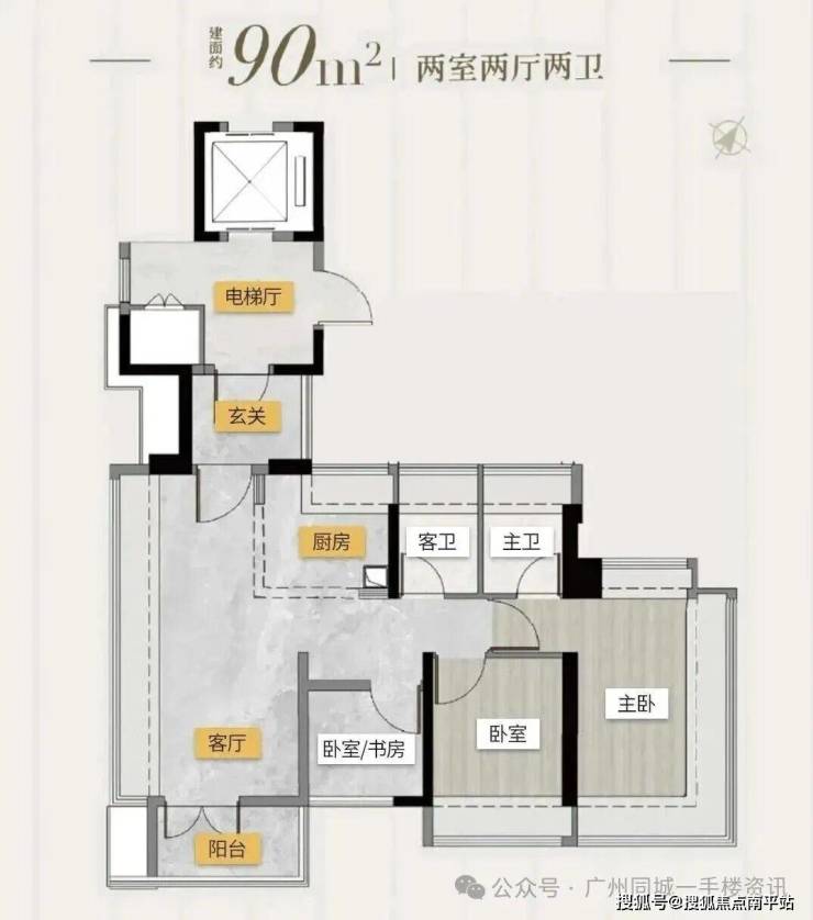 塔楼01东边位:90㎡竖厅三房,东南向