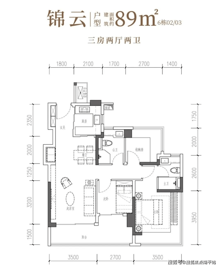 锦云·建面约89㎡3房2厅2卫:南向阔厅,景致常驻,间间开阔,尺度舒适