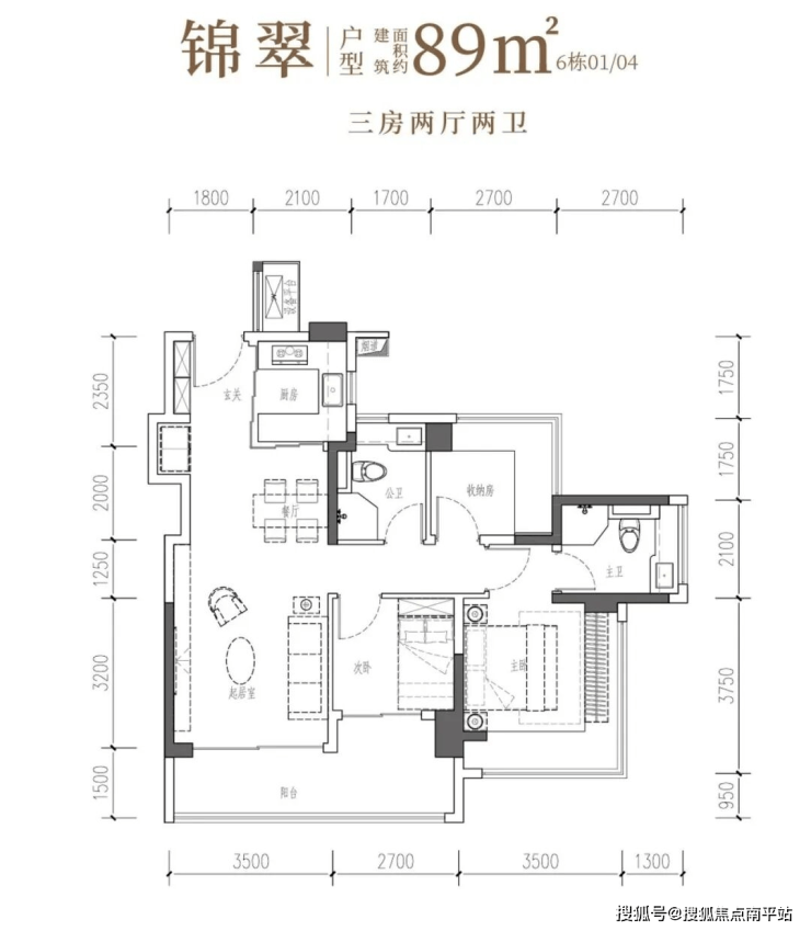 锦翠·建面约89㎡3房2厅2卫:南向宽厅,阳光满溢,主卧L型采光,空间户户舒适