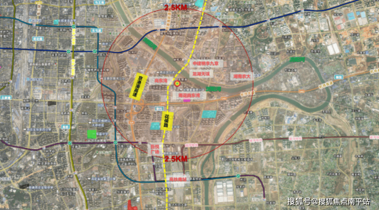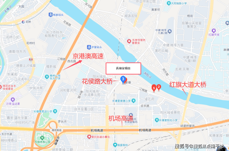 先看地理位置,项目西临京港澳高速,花侯路大桥,东红旗大道主干道,南临长沙大道机场高速,北边则是浏阳河。看似 “四至通达”,实则被三条交通大动脉死死困住。