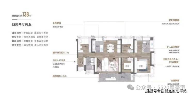 大阳台,餐客厅一体化,玄关进来不对着客厅和主卧门,优化了横厅风水对冲问题,无论是横厅还是竖厅得房率都做到了82%,综合使用率高达89%。