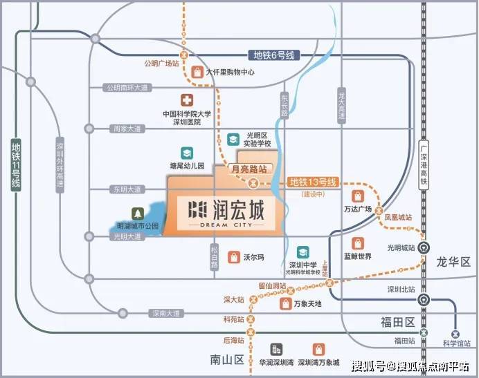 华润 润宏城 位于光明区凤凰街道塘尾社区,光明大道和东长路交汇处的西北侧,刚好在13号线“月亮路站”附近,北部接壤东周路。