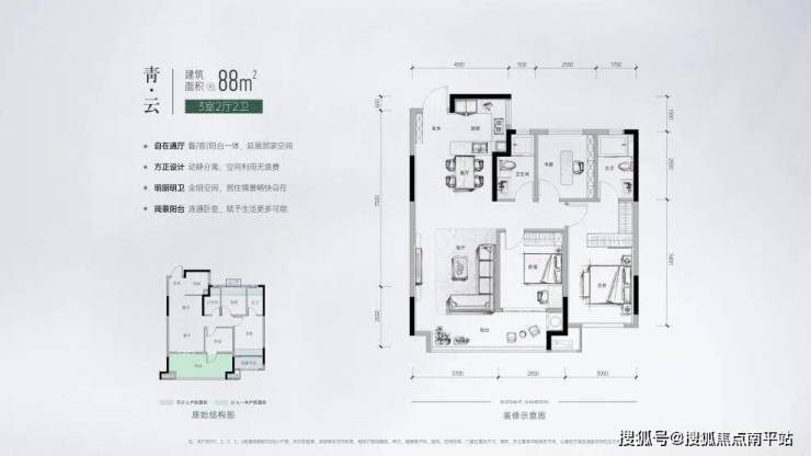 建面约 88 ㎡户型,市场上80+同类产品中少有的三房两卫产品, 比老规户型多出 10%赠送率 ,相当于目前市面上105 ㎡户型,可以说性价比非常高,这个户型就特别适合处在陪读阶段的家庭,家长和孩子都有非常充足的休憩空间。3.7m的客厅开间搭配 6.5 宽的南向双联阳台,尺度感十足。