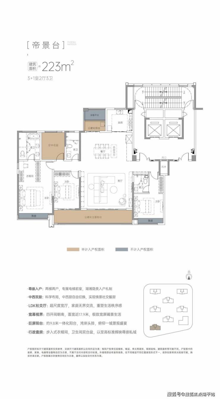 约223㎡纯粹平层 :中西双厨、LDK社交厅、面宽约17.9米、4开间朝南、约9.8米一体化阳台、行政双套房(步入式衣帽间、浴室双台盆)。