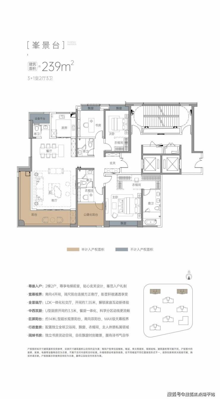约239㎡峯境平层 :中西双厨、LDK全景端厅、270°环幕阳台,4开间朝南、行政双套房(步入式衣帽间、浴室双台盆)