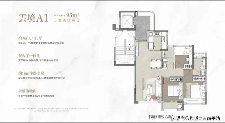 2. 95㎡做3房2卫,带独立电梯厅和阳光入户。