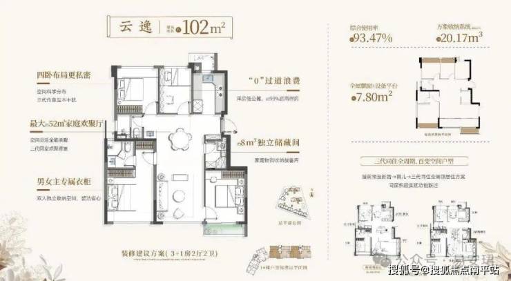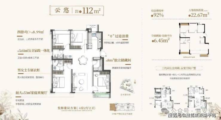 89㎡户型配备约4.5m³独立储藏间,全屋收纳量达16m³,相当于三只成年大象的体积。102-113㎡户型储藏间约8m³,全屋收纳达22-22.7m³。