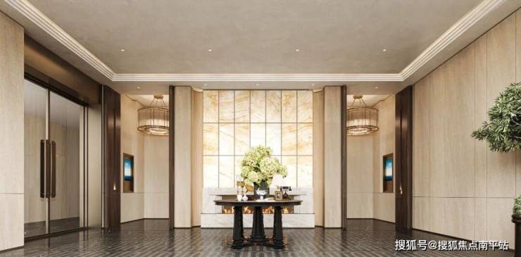 入户大堂设计标准超五星级酒店,白冰玉透光石材搭配贝克米黄大理石作为屏风背景,定制深灰大理石地砖,营造归家之路的奢华与尊崇。