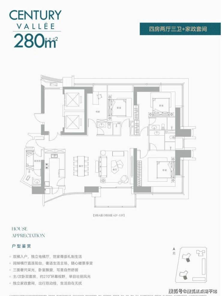 户型面积:240㎡、280㎡(3-4房)、380㎡(4+1房),梯户比为8梯3户,部分户型配备独立电梯