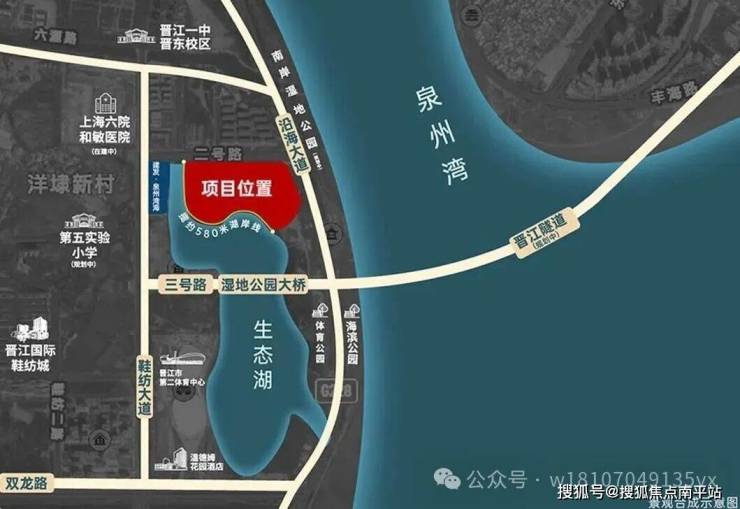 项目所在的晋东板块与东海核心区仅一桥(晋江隧道,规划中)之隔,板块更是内生泉州顶级的交通、文体、医疗等城市资源。项目周边 沿海大通道、双龙路、晋新路等交通便捷, 可达性高,南侧有 晋江第二体育中心, 西侧有 和敏医院、第五实验小学分校、鞋纺城等,全方位满足塔尖圈层生活需求。