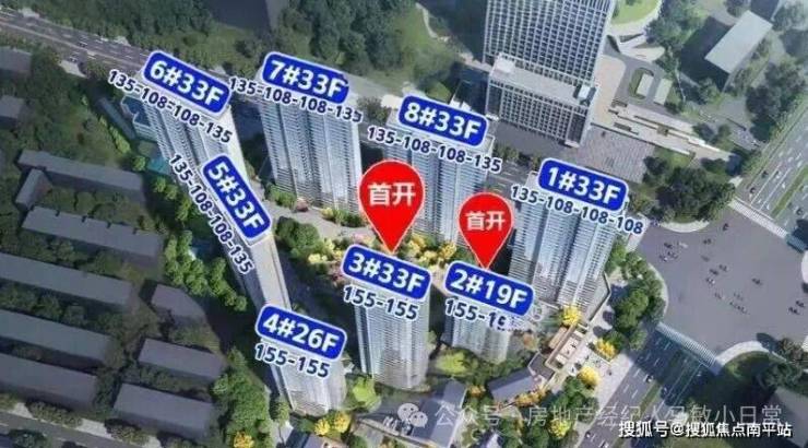 西南侧高层5栋,北面一排高层6、7、8、1栋:33层,2梯4户,108平3房,135平4房;