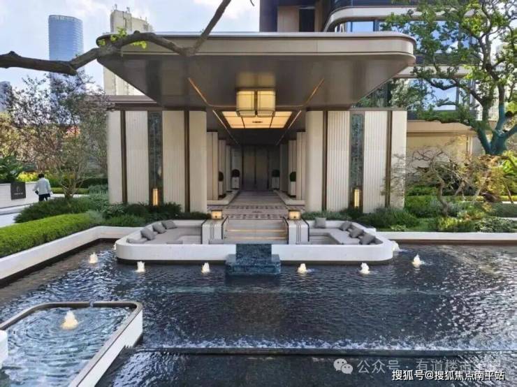 石材和金属、玻璃三种材质不断组合演绎,带来了丰富迷人的场景。震撼于73.8×9M小区大门的恢弘气场、地下大堂的流光溢彩、建筑立面的超流体视觉,把项目的高级感体现的淋漓尽致。