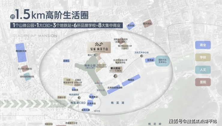 约1.5km范围,梅溪湖CBD、国际文化艺术中心、览秀城、金茂大厦……国际都会心上,万象繁华生活。