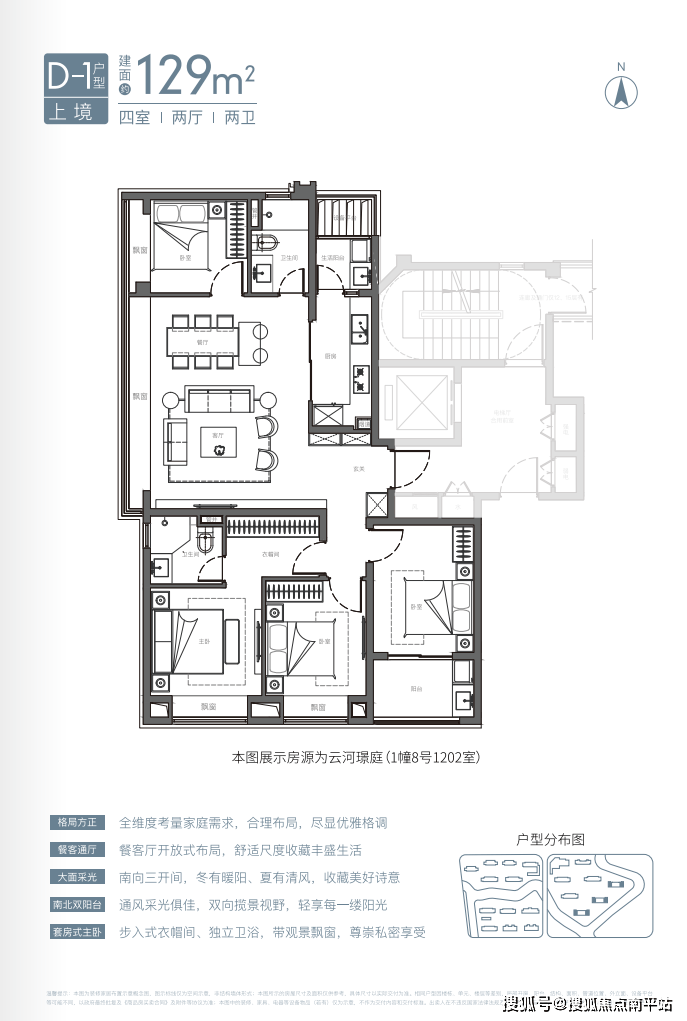 总体来看,这样一套约129平的户型做到四房两厅两卫,做到市面上极度稀缺的边厅设计,采光面、景观效果都极佳。户型整体没有浪费面积、利用率高,设计非常合理。