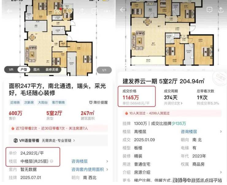 如今的二手,桂语的楼王247平,二手挂牌2.4W,养云一期的204平,二手成交5.6W。
