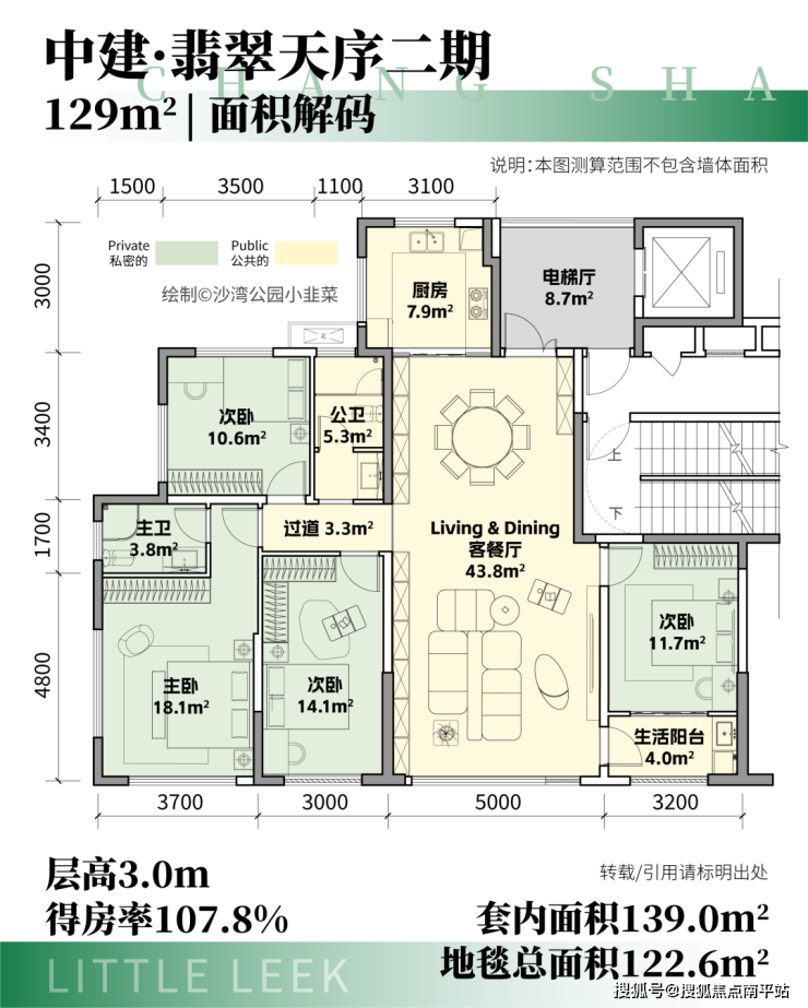 1、得房率约107.8%,客厅面宽5.0m,主卧面宽3.7m,总面宽14.9m,保持了空间感;