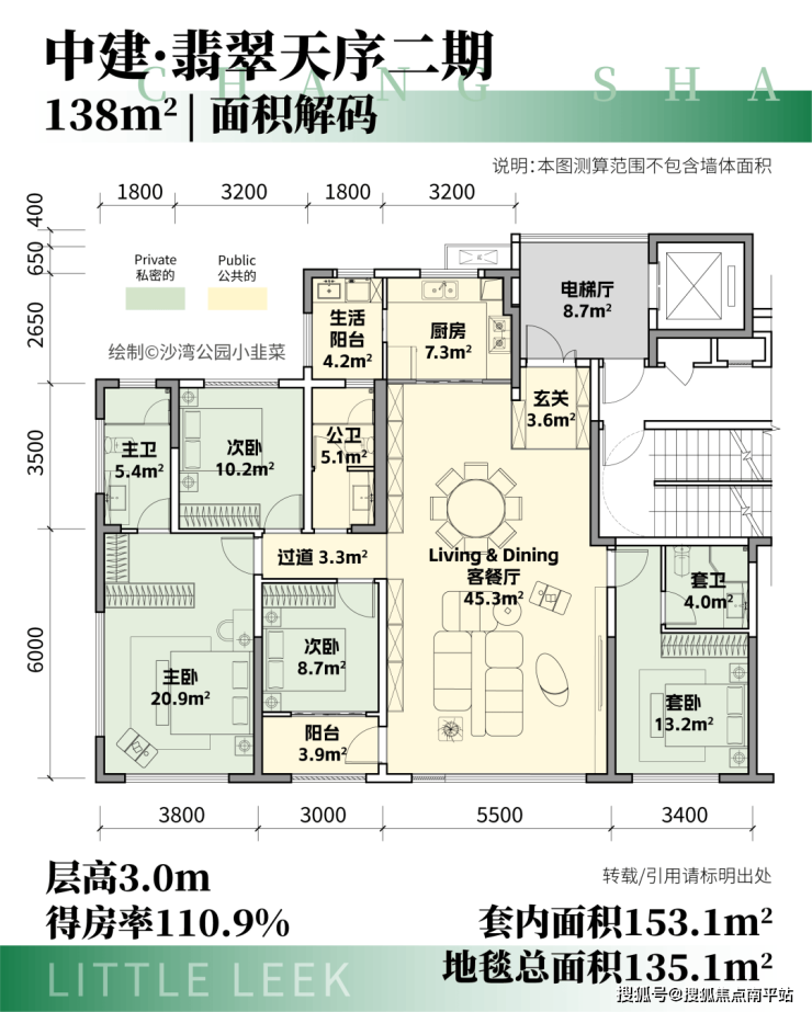 1、得房率约110.9%,优化版的167㎡户型,客厅开间5,5米,只比167㎡户型少0.3米,但新增了南北双阳台;