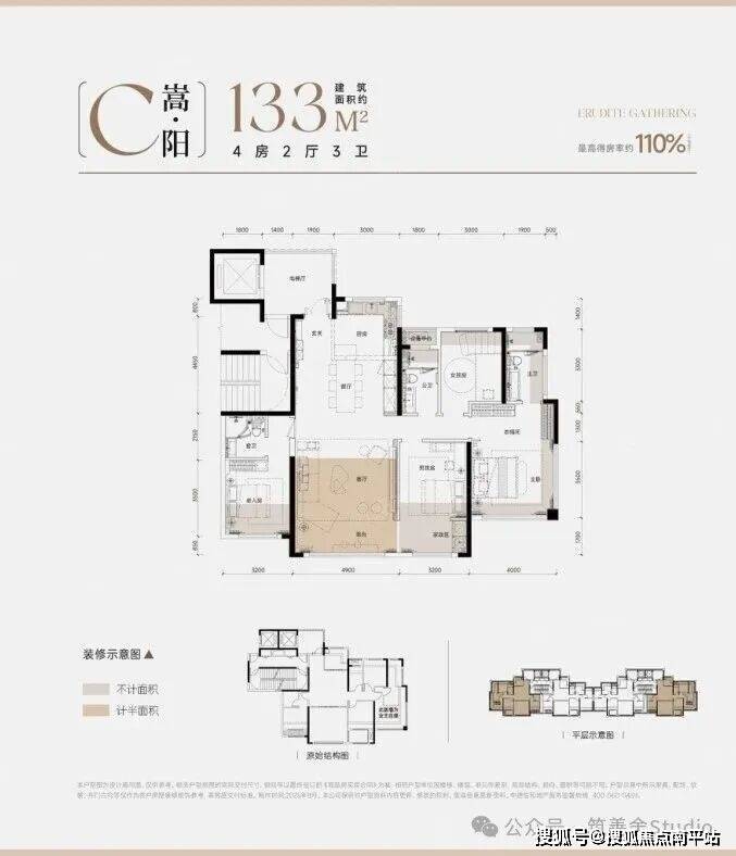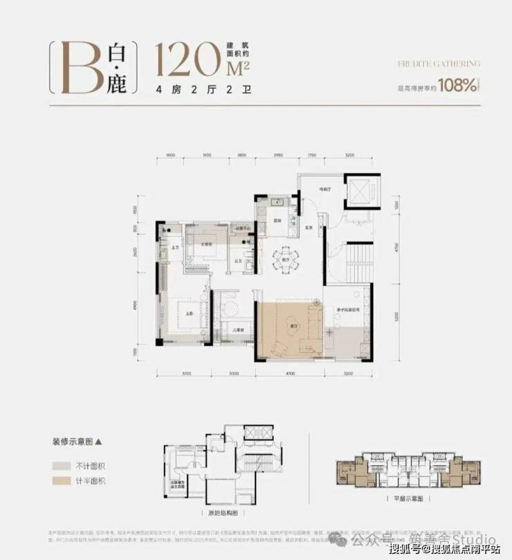建筑面积约120㎡户型,专为多孩家庭打造成长空间,四开间全朝南,总面宽达14.6米,客餐厅开间4.7米,阳光全天候倾泻;主卧双面采光,主卧与主卫均实现双面采光,通透感极佳;多功能社交厅,次卧与客厅墙体可灵活改造,轻松实现书房、客厅、客房于一体的复合空间。