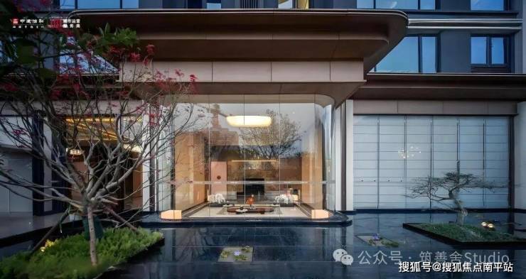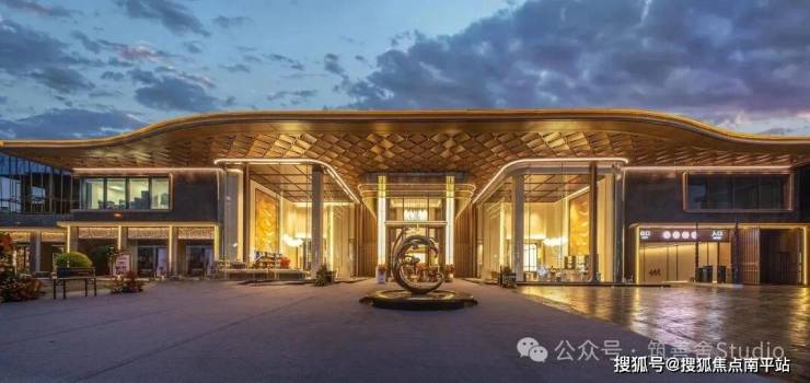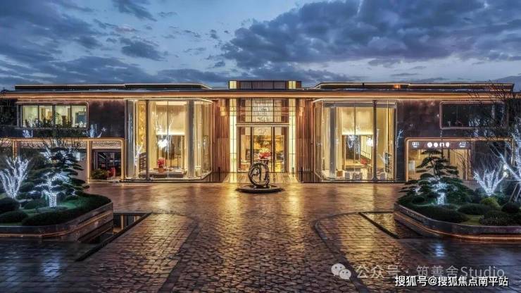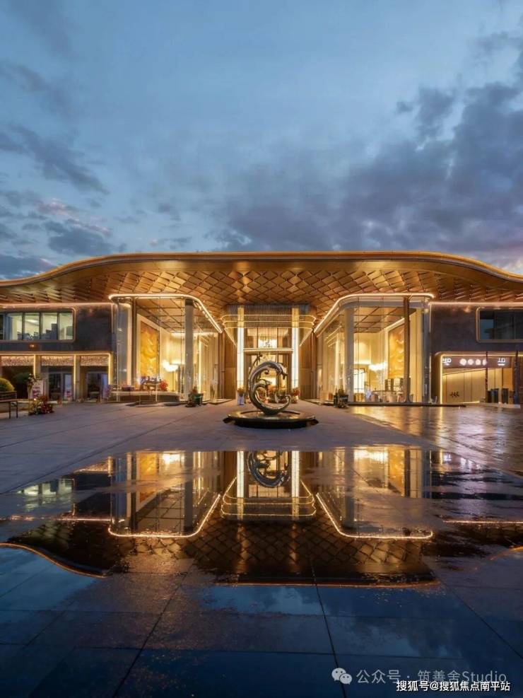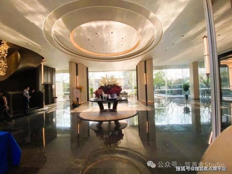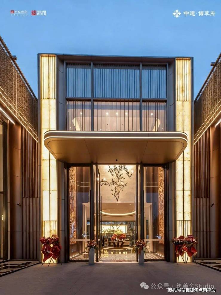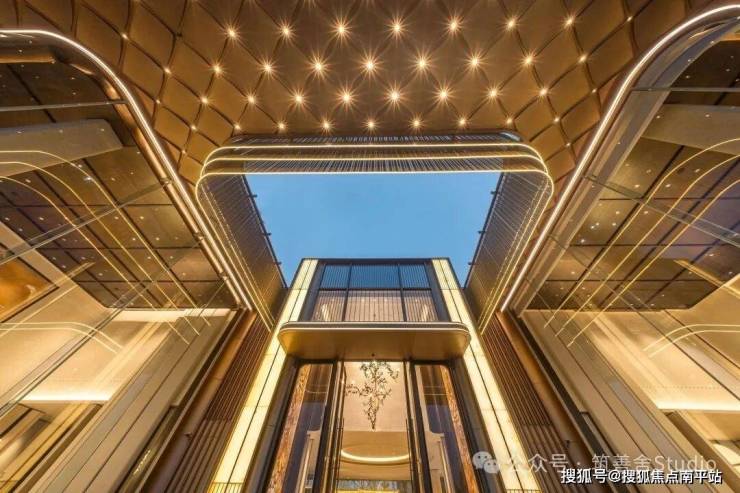 近百米宽、近十米高的宏伟尺度,第一眼便足以震撼人心。大门两侧由18块全幕落地玻璃构成,两侧矗立的气派造型罗汉松,更添豪宅气场。穹顶采用双层铝板打造的“星空顶”,超过300片鎏金鳞纹铝板全手工拼接,并镶嵌300余盏星灯,归家时刻的仪式感被拉满至极致!